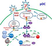 Figure 2. CD4-mediated endocytosis of HIV-1 leads to persistent/repeated IFN-I induction in pDCs. HIV-1/CD4 traffics predominantly to early and recycling endosomes, where HIV-1 genomic RNA interacts with TLR7 to activate MYD88, NFκB, IRF7, and More about this image found in CD4-mediated endocytosis of HIV-1 leads to persistent/repeated IFN-I induct...