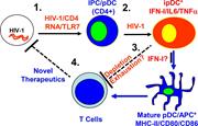 Figure 3. Induction of inflammatory or immature pDCs (ipDCs) during chronic HIV-1 infection. HIV-1 activates pDCs via CD4-dependent endocytosis and HIV-1 RNA-mediated TLR7 activation (1). Persistent activation of pDCs by HIV-1 leads to More about this image found in Induction of inflammatory or immature pDCs (ipDCs) during chronic HIV-1 inf...