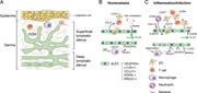 Figure 1. Organization and function of dermal lymphatic vasculature. (A) Skin LVs are organized in superficial and deep lymphatic plexuses. Superficial LVs are mostly capillaries, whereas deep lymphatic plexus contain collecting LVs draining to More about this image found in Organization and function of dermal lymphatic vasculature. (A) Skin LVs ar...