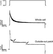 Figure 2. Examples of VRAC single-channel currents in a C6 glioma cell. Top panel shows membrane voltage. Middle panel shows voltage-dependent inactivation of whole-cell current induced by stepping membrane voltage from −80 to 120 mV. Bottom More about this image found in Examples of VRAC single-channel currents in a C6 glioma cell. Top panel sh...