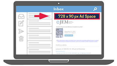 Subscribers and non-subscribers alike may sign up to receive Email Alerts from JCB, JEM, and JGP to learn when new research is published. There are three different types of Alerts for each of the journals: Complete Issue (monthly, the first Tuesday of the month), Daily Publication-Weekly frequency (Wednesdays), and Daily Publication-Daily frequency. We accept banner advertising in monthlong blocks to display your message at the top of each email of your desired journal.
