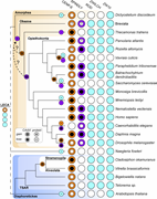 Figure 7. Comparative genomics of fibrous corona formation mechanisms in eukaryotes. Phylogenetic profiling of CENP-E, the CAAX box of CENP-E, SPINDLY, the CAAX box of SPINDLY, ROD, ZWILCH, and ZW10 across eukaryotic diversity represented by selected species. Evolutionary reconstructions More about this image found in Comparative genomics of fibrous corona formation mechanisms in eukaryotes. ...
